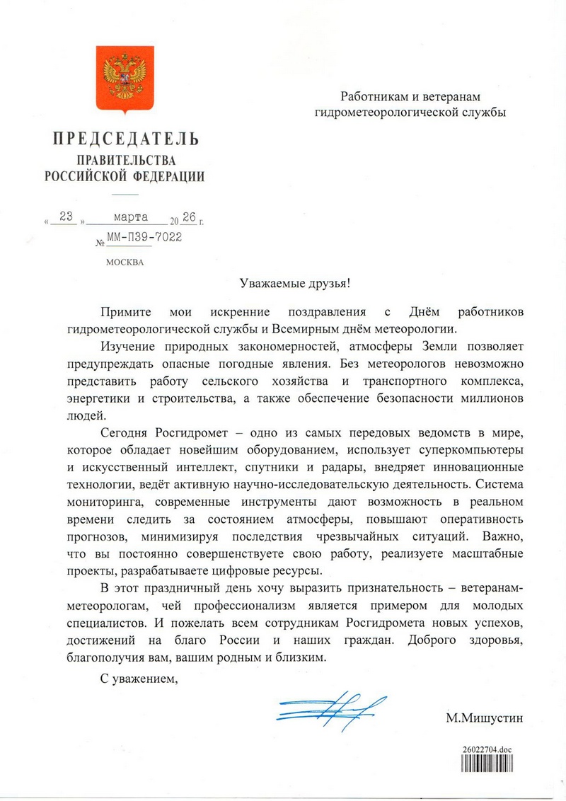 Дорогие коллеги, поздравляю всех вас с профессиональным праздником — Днем работников гидрометеорологической службы России.