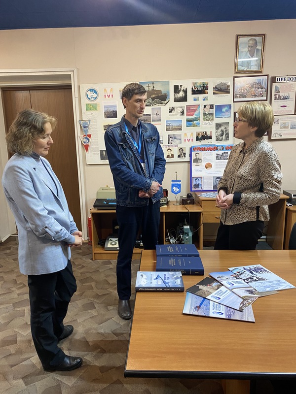 Далее в Музей истории прибыли коллеги - начальник отдела фонда данных и научно-технической информации ААНИИ Замятин Владимир Юрьевич и главный специалист редакционно-издательской группы ААНИИ Емелина Маргарита Александровна, которые в этот день принимали участие в научно-практической конференции «Наследие Арктики», посвященной 80-летию Победы, 100-летию открытия Кольского Оленеостровского могильника и Году защитника Отечества, проходившей в Мурманском арктическом университете. Сотрудников ААНИИ в музее встречала начальник ФГБУ «Мурманское УГМС» Чаус Оксана Михайловна. При встрече гости вручили Оксане Михайловне печатные издания ААНИИ, включающие 100-летние летописи Арктического института. Встреча с коллегами проходила в дружеской беседе по взаимодействию и дальнейшему сотрудничеству в области архивных документов, трудов и музейного дела. Закончилась поздним вечером за торжественным чаепитием. Сотрудники ААНИИ поблагодарили коллектив ФГБУ «Мурманское УГМС» за теплый и радушный прием, о чем сделали запись в книге «Отзывов и предложений».