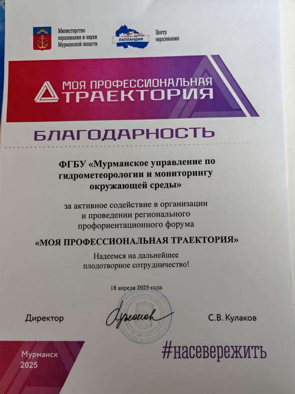 18 апреля 2025 года представители ФГБУ «Мурманское УГМС» приняли участие в региональном профориентационном форуме «Моя профессиональная траектория», который проходил в ГАНОУ МО «ЦО Лапландия».
