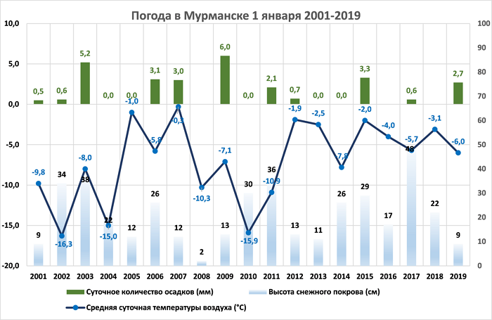 Средняя суточная температура воздуха 1 января в Мурманске составляет минус 9,1 °С. Чаще всего (в 28 % случаев) средняя суточная температура воздуха в этот день находится в пределах от минус 5 до минус 10 °С.